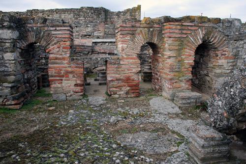 In the north half of the building there is a large room with floor made of sandstone slabs. The room is determined as apoditerium or dressing room. At the west side of the apoditerium there is an entrance to an apsidal room which is probably the frigidarium. To the south there are three other apsidal rooms. The first room is a tepidarium and it has a small pool. From this room one can enter the other two which are heated by the hypocaust system. The fireplace is located below the third apsidal room and it can be reached from the apoditerium. To the east of the dressing room there are two other rooms. The one with the draining channel is thought to be the latrine (toilet).